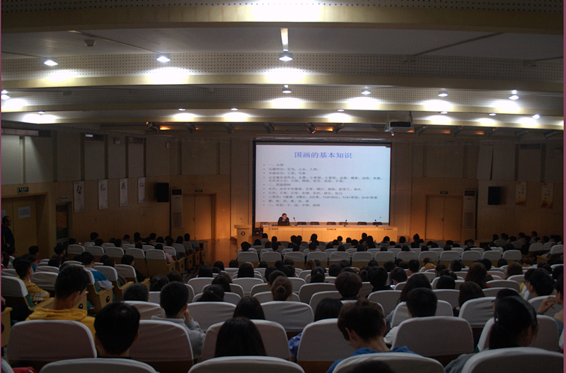 肖教授首先从中国画的分类、特点讲起,就中国画的形式、工具材料、笔法、墨法、进行了精彩的讲解。他从中国现代名家齐白石、徐悲鸿、潘天寿、王雪涛、范曾讲到陕西的刘文西、王西京、王有政等,通过对知名画家生平及作品风格的剖析,对怎样鉴赏中国画作品从构图、造型、色彩、气韵等方面作了详细、生动的讲述,他风趣、充满哲理的话语,深深地吸引着全场观众,肖幸海教授用自己丰富的艺术经验、对中国画的深刻感悟,为我院师生上了一堂生动的美育课。深入浅出、直观形象的精彩讲述,赢得了现场同学们阵阵掌声。