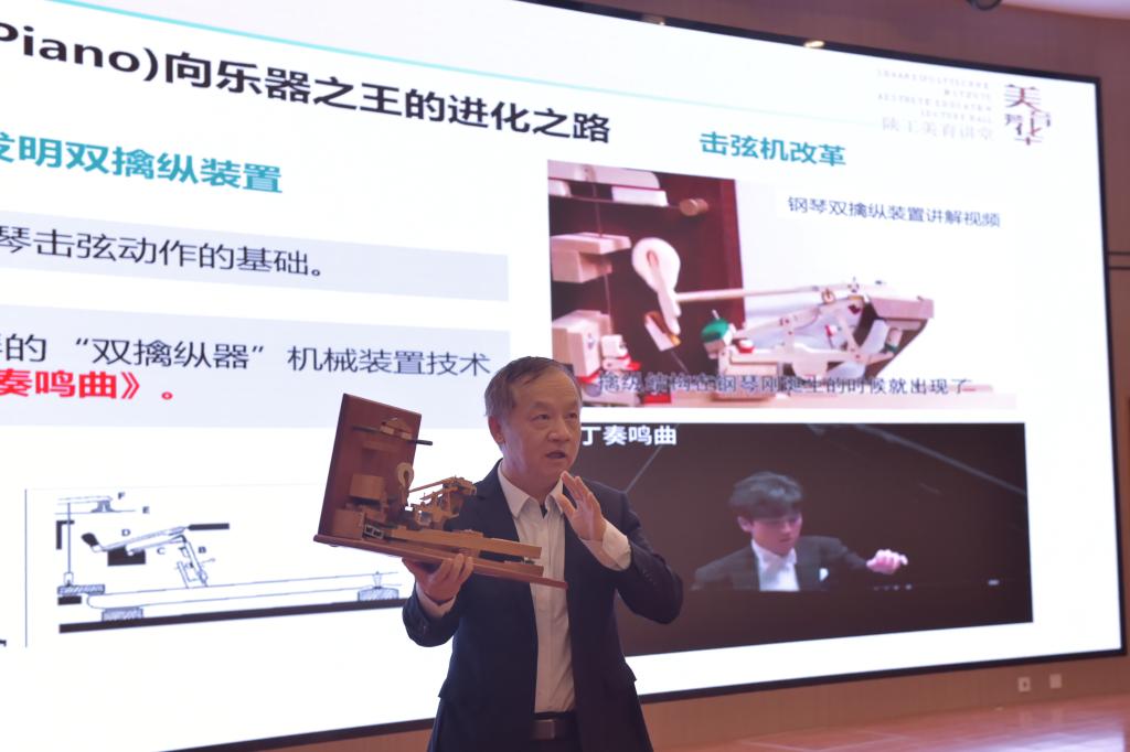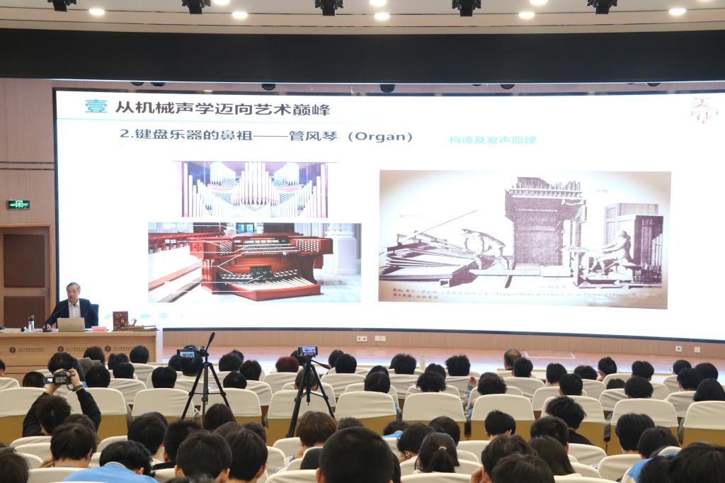 精密齿轮遇见流动的音符,严谨思维碰撞浪漫的灵魂。付胜利老师介绍了键盘乐器的鼻祖—管风琴、钢琴的前身—击弦古钢琴、羽管键琴,剖析了早期钢琴向乐器之王的进化之路,手拿擒纵装置向同学们演示钢琴发音的基本原理;接着以音乐大师与钢琴共舞为标题介绍了巴赫、莫扎特、贝多芬在钢琴的演进长河中所谱写的不朽名作,带领同学聆听贝多芬《月光奏鸣曲》、肖邦《“英雄”波兰舞曲》等,领略不同钢琴大师的艺术风格;随后讲解了钢琴传入中国以及钢琴中国化的基因改造之路,与同学们一起欣赏了具有鲜明中国民族风格的钢琴音乐作品《牧童短笛》《在那遥远的地方》及协奏曲《保卫黄河》等。现场还安排了互动环节。