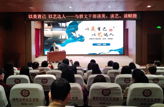 为提升群文干部的艺术素养与专业能力,进一步推动群众文化事业发展。3月26日上午,我校美育部部长付胜利教授受邀在咸阳市民文化中心为全市群文干部做以“以美育己 以艺达人——与群文干部谈美、谈艺、谈赋能”为题的专题讲座。讲座由咸阳市群艺馆馆长李军主持,十三个县区群文干部参加了学习。