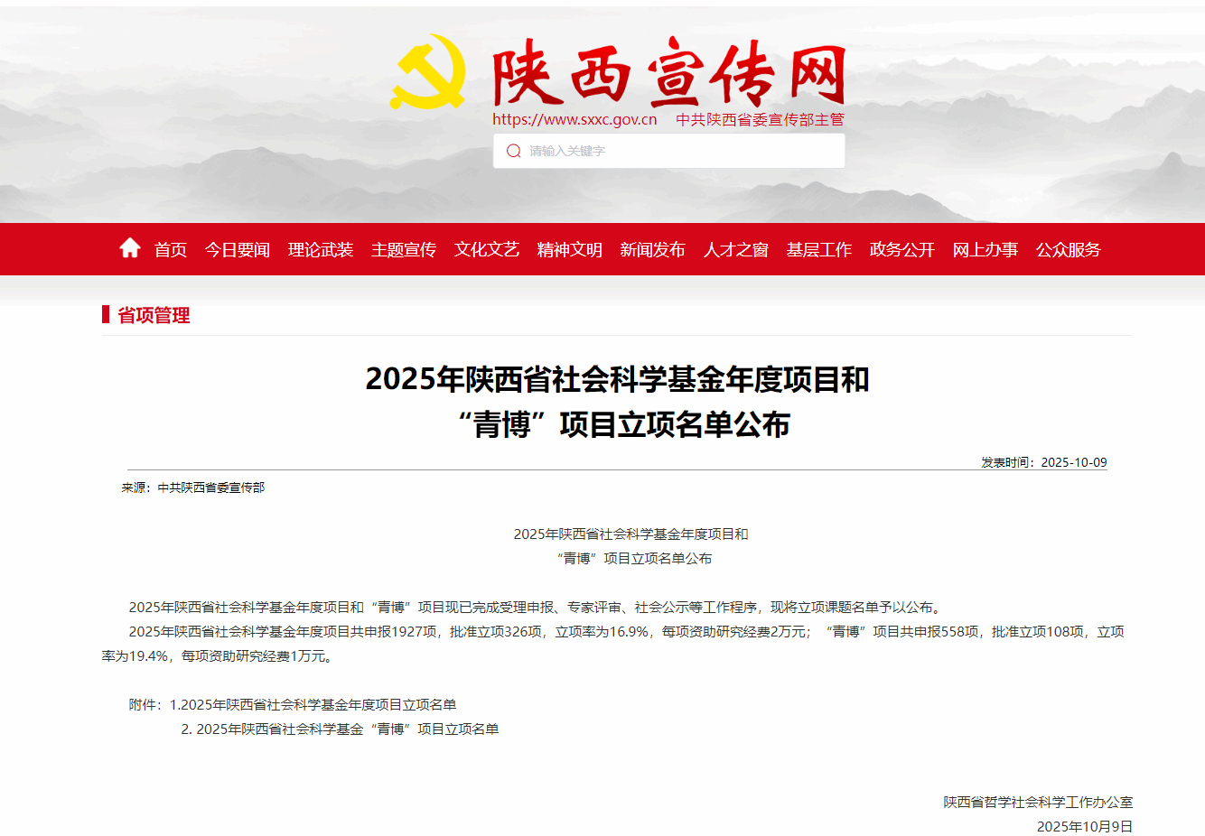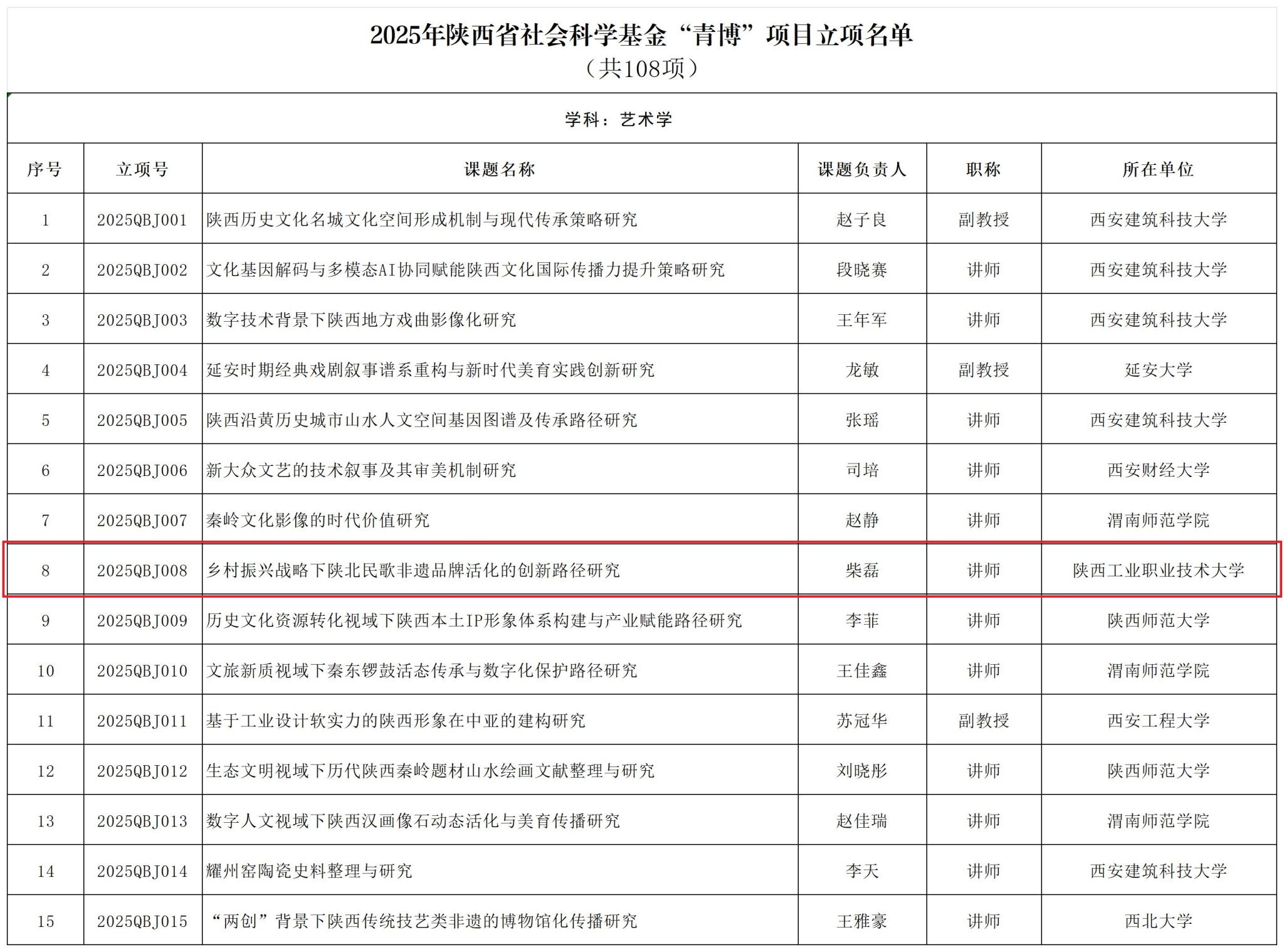 10月9日,陕西省哲学社会科学工作办公室公布了 2025 年陕西省社会科学基金年度项目和 “青博” 项目立项名单,美育部柴磊博士主持的 “乡村振兴战略下陕北民歌非遗品牌活化的创新路径研究” 成功立项 “青博” 项目。